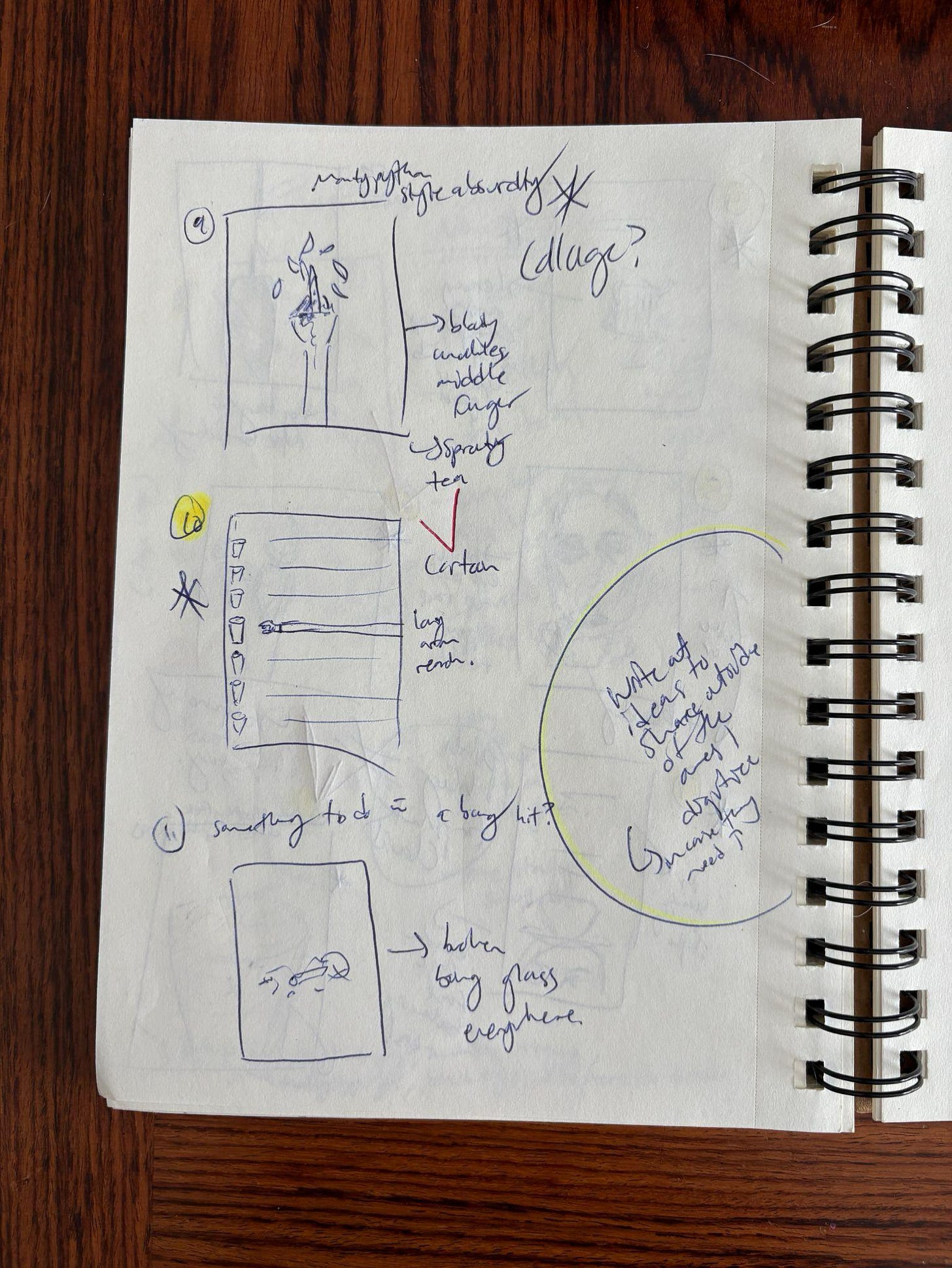 Here are some of my early notes and VERY messy sketches that only I could understand. Sometimes I write out the ideas; I create a list and mull them over to determine which ones will warrant trying a digital rendering. I will workshop the ideas that the author and publisher are excited about, but I’ll keep brainstorming other ideas that may have come up during my reading or thinking about the book. I keep writing things down, drawing thumbnails, and researching images until I’ve got a good number of ideas that I’m personally really fired up about.