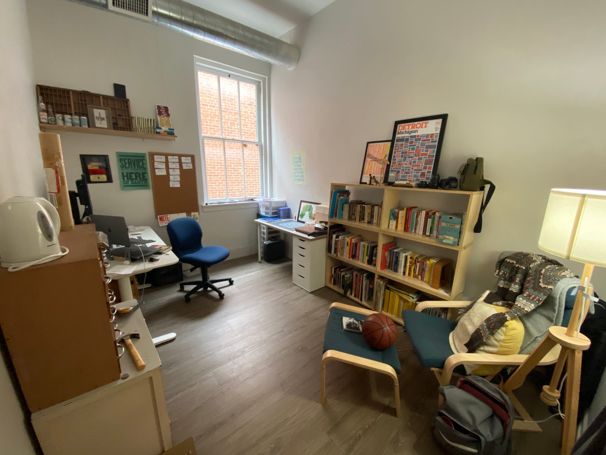 I started renting office space above a local restaurant in September 2023. I needed a place to work, and the 960-square foot house I was also renting increasingly lacked available space as the number of children in our home went from zero, to one, to two. My office space—my little room, as I tend to call it—became a 130-square foot refuge where I could focus and knew the mess was mine. Here I designed, collaged, photographed, read, and practiced my shooting form below the room’s tall ceilings.