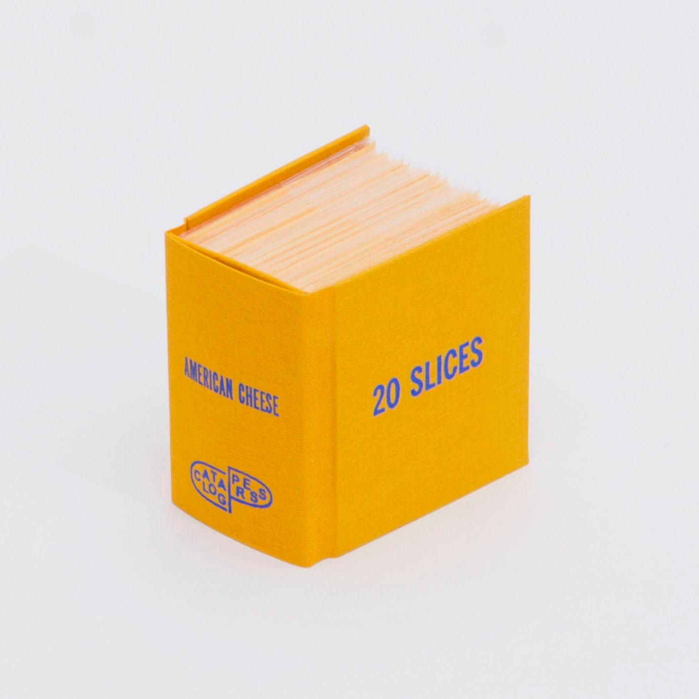 These books could easily be dismissed as ridiculous. But I think that, should the viewer move past this initial reaction, Denzer’s work encourages consideration for objects, materials, and images we might not pay close attention to. In short: You might think more, if not differently, about toilet paper and how we interact with it. Seeing a book made from headlines about people dying might encourage you to think about death, news, and our relationship with both. A book made of slices of American cheese makes me think about preservatives and “cheese products” and what we consider food.